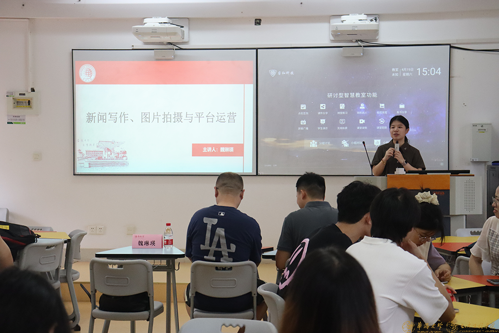 会议伊始,魏琳瑛老师结合自己的新闻编辑工作经验,从新闻写作和图片拍摄两个方面为切入点,细细讲解了新闻网与微信公众号编辑的技巧和注意事项。在新闻写作方面,魏琳瑛老师强调抓速度,抓质量,适当的利用具体数据、时事热点来提高文章的说服力,同时分类阐述不同活动文章撰写的具体要求和注意事项。在图片拍摄方面,魏琳瑛老师提出了画面清晰、构图方正、传达信息和情绪三个基本要求。接着结合图片示例分析构图、光影等进阶技巧,详解不同场景和图片类型的拍摄技巧,并分析拍摄中容易遇到的错误并提出解决方法。